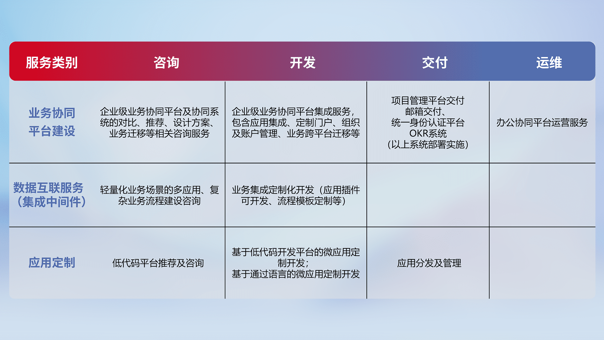 针对钉钉、、企微、、、、IDaas等平台级产品提供产品的规划、、方案、、、、交付、、、定制化开发等服务,,,实现如统一协同办公、、、、智能客户服务、、、混合会议管理、、、智能数据查询、、等业务场景,,实现数字化转型。。。