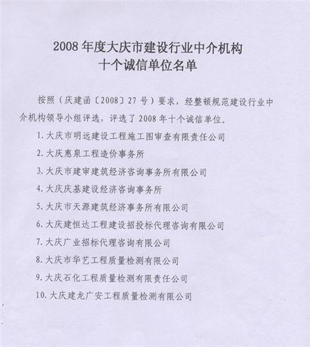 2008年度大庆市建设行业中介机构十个诚信单位之一